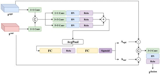 Let , denote the feature tensors extracted from the optical and SAR branches, where , and represent the channel number, height, and width, respectively. In order to eliminate the channel distribution difference between modes, 1 × 1 convolution is introduced as a linear projection operator to map the two channel features into a unified channel space: