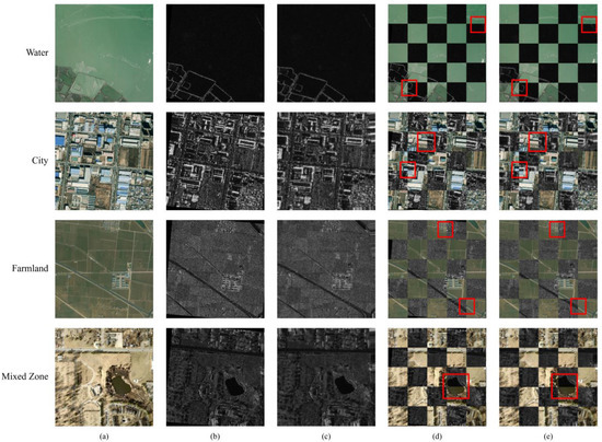 Feature-based registration methods achieve geometric alignment by extracting structural or shape features (such as corners, edges, line segments, etc.) from the image and establishing the spatial correspondence between them [6,7]. In areas where the structure of ground objects is clear and the texture is distinct (such as urban buildings, roads, or coastlines), optical and SAR images often have a certain structural correspondence. Therefore, feature-based methods can achieve registration quite well. However, speckle noise, structural blurring, and local geometric distortion are widespread in SAR images, which makes the extraction and matching of feature points prone to errors. Region-based registration methods achieve registration by comparing the similarities of image gray levels or statistical features. Common indicators include Mutual Information (MI), normalized cross-correlation (NCC), Phase Correlation, etc. [8,9]. In regions with relatively similar radiation distributions or stable local contrast (such as areas where the terrain contours in SAR images are consistent with those in optical images), regional similarity measurement can achieve certain effects. This type of method does not rely on explicit feature extraction and thus still has certain applicability in scenarios with sparse features. However, there is a strong nonlinear correspondence between optical and SAR images in terms of gray level and texture distribution. The light and dark distribution in optical images often do not have a direct correlation with SAR scattering intensity, making similarity measures based on gray level or intensity ineffective. Furthermore, the speckle noise of SAR will further reduce the stability of similarity calculation, causing the regional registration results to easily fall into a local optimum.