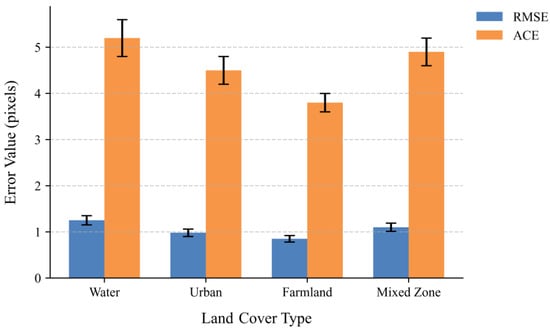 Across all land cover categories, OSR-Net consistently demonstrates the highest registration accuracy, with an average RMSE of less than ~1.10 pixels and an ACE of about 5 pixels. The model maintains stable performance in diverse scenarios, including complex urban structures, regular farmland, weakly textured water surfaces, and highly heterogeneous mixed regions. This indicates that OSR-Net has strong generalization ability and robustness under different imaging conditions.