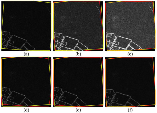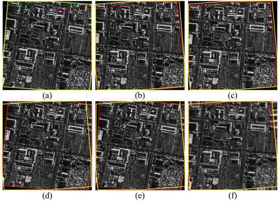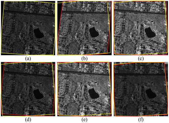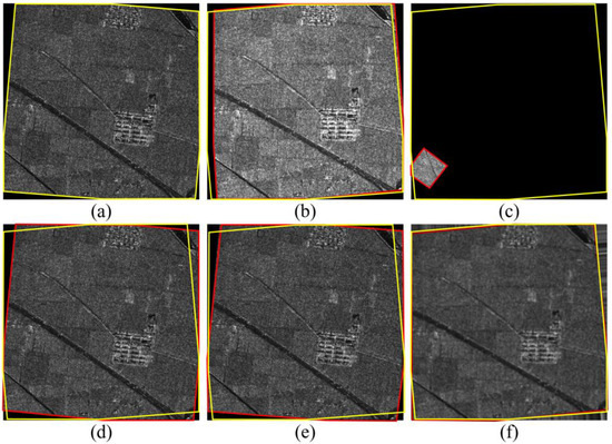 In Figure 7, Figure 8, Figure 9 and Figure 10, (a) shows the target image to be registered, (b) shows the registration result using OS-SIFT, (c) shows the registration result using RIFT2, (d) shows the registration result using DHN, (e) shows the registration result using XFeat, and (f) shows the registration result using the proposed OSR-Net. The red boxes denote predicted positions, and the yellow boxes represent ground-truth locations.