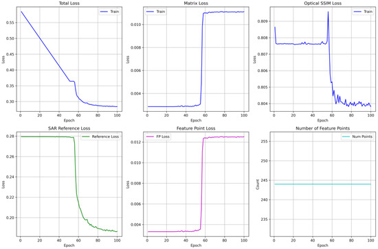 In optical–SAR image registration tasks, it is difficult to fully describe many key aspects of registration quality using a single loss function. For example, although only optimizing the parameters of an affine matrix can ensure geometric accuracy, it is difficult to correct the local deformation caused by the difference in the imaging mechanism. On the contrary, if only relying on the similarity constraint at the image level, it is easy to fall into local optimization, resulting in inaccurate transformation results. Therefore, building a multi-constraint joint optimization loss system that can achieve a balance between geometric accuracy, structural consistency, and physical rationality is of great help in improving the performance and robustness of cross-modal registration.