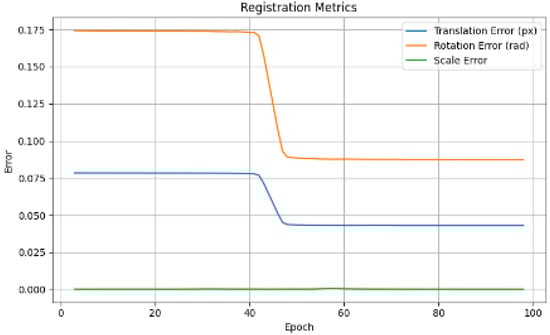 Figure 12 illustrates the evolution of the three errors metrics during training. The model converges after around 40 epochs, with rotation error showing the most significant decline, translation error remaining consistently low, and scale error approaching zero. These results indicate that the proposed OSR-Net achieves stable and accurate modeling across all geometric transformation components.