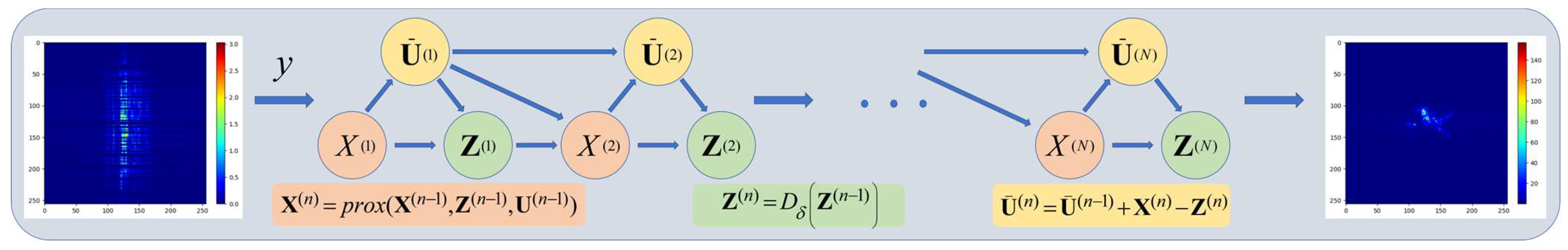 - Li, X.; Bai, X.; Zhang, Y.; Zhou, F. High-resolution ISAR imaging based on plug-and-play 2D ADMM-Net. Remote Sens. 2022, 14, 901. [Google Scholar] [CrossRef]