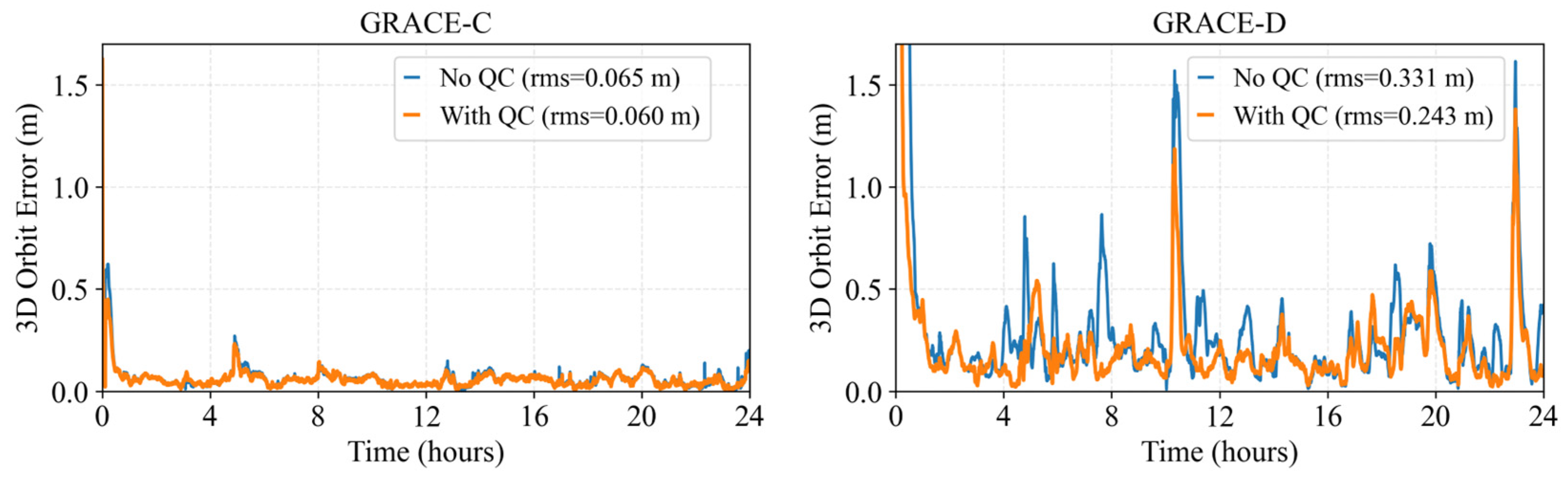 - Robustness of the quality control strategy: The adopted iterative quality control method based on post-fit residuals effectively suppresses GNSS observation noise and outliers, thereby significantly improving the stability of the filter and the orbit accuracy.