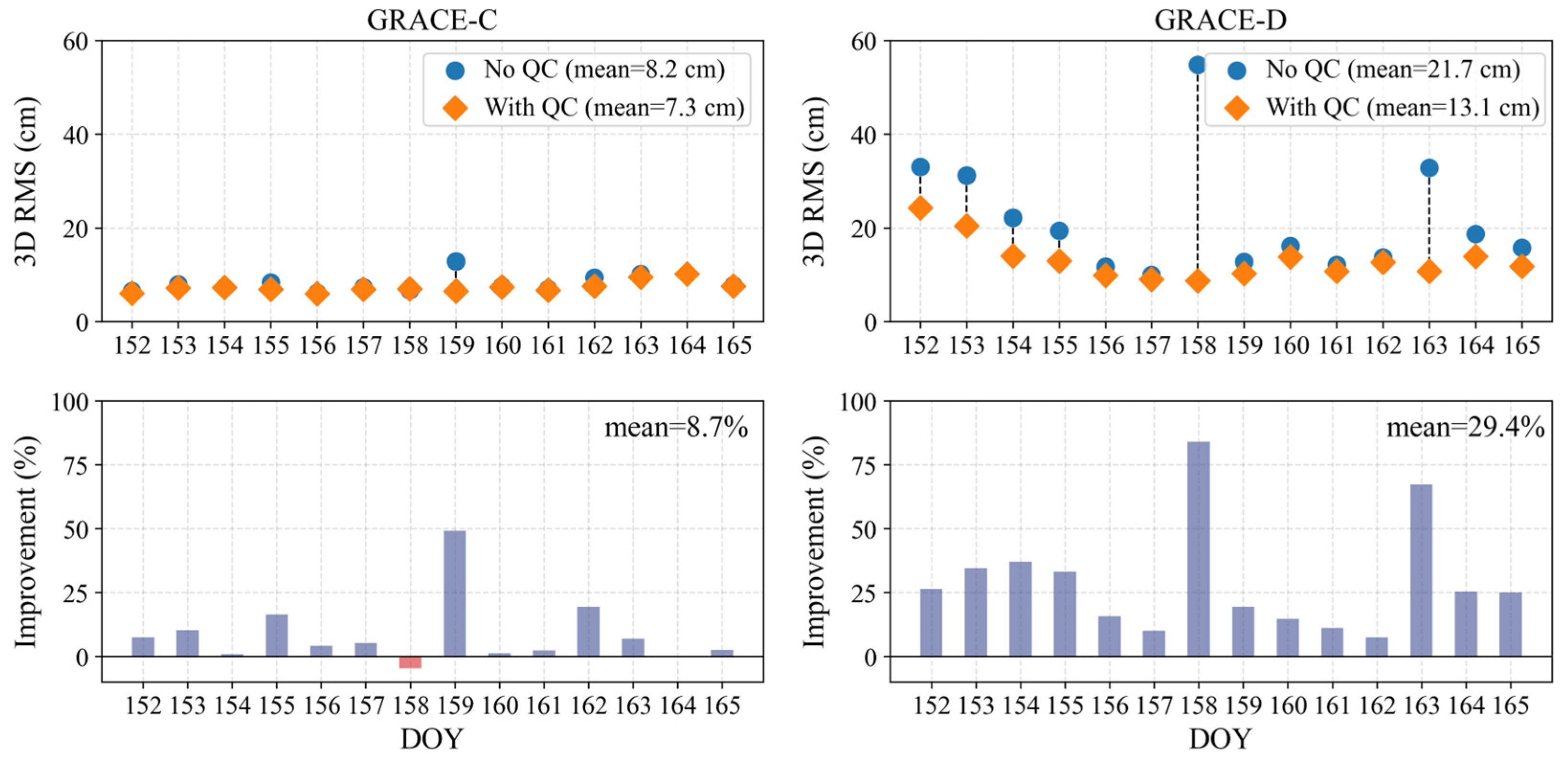 - Efficacy of inter-satellite range measurements in asymmetric conditions: The experiment verifies that the inclusion of inter-satellite range measurements yields substantial accuracy improvements for GRACE-FO under asymmetric observation conditions. This is particularly decisive for the satellite with poor data quality (GRACE-D), where orbit accuracy was improved by 39%, effectively recovering its performance to the level of GRACE-C.