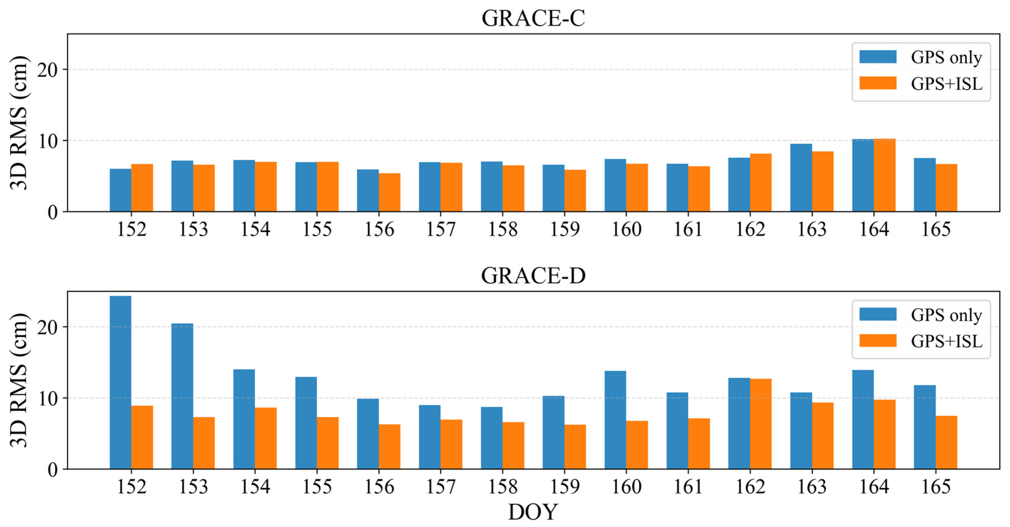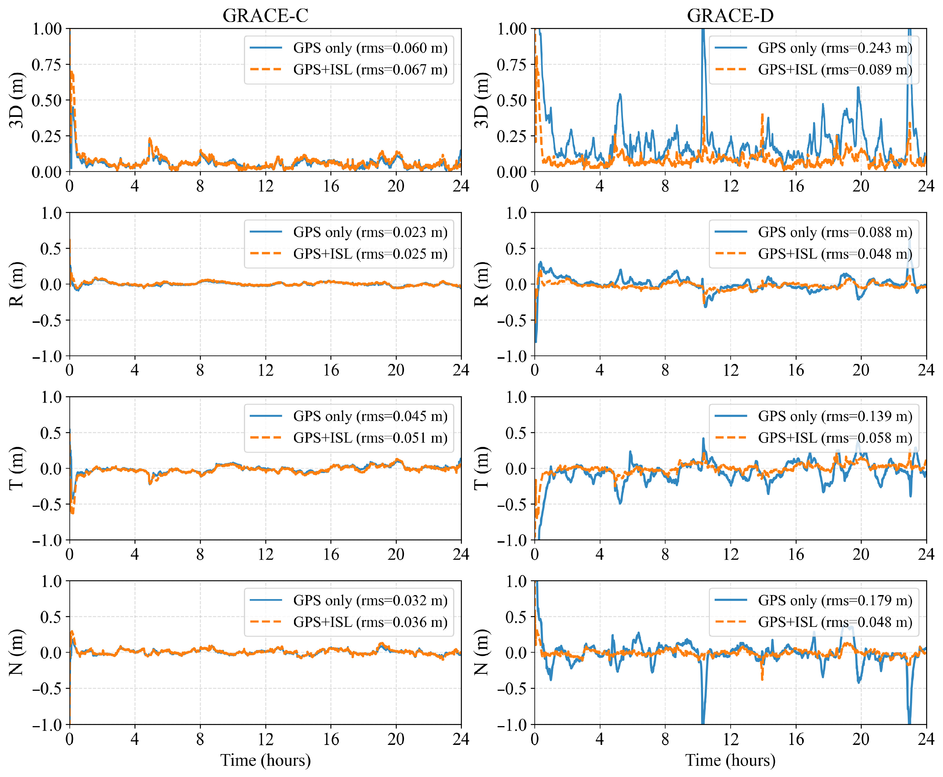 - Scheme A (GPS-only): The orbits of GRACE-C and GRACE-D are estimated using only onboard GPS observations. This configuration is designed not only to verify the fundamental capability of the RTPOD strategy, but also to serve as a rigorous control group. By comparing against this baseline, the specific contributions of inter-satellite range observations can be isolated and assessed.
