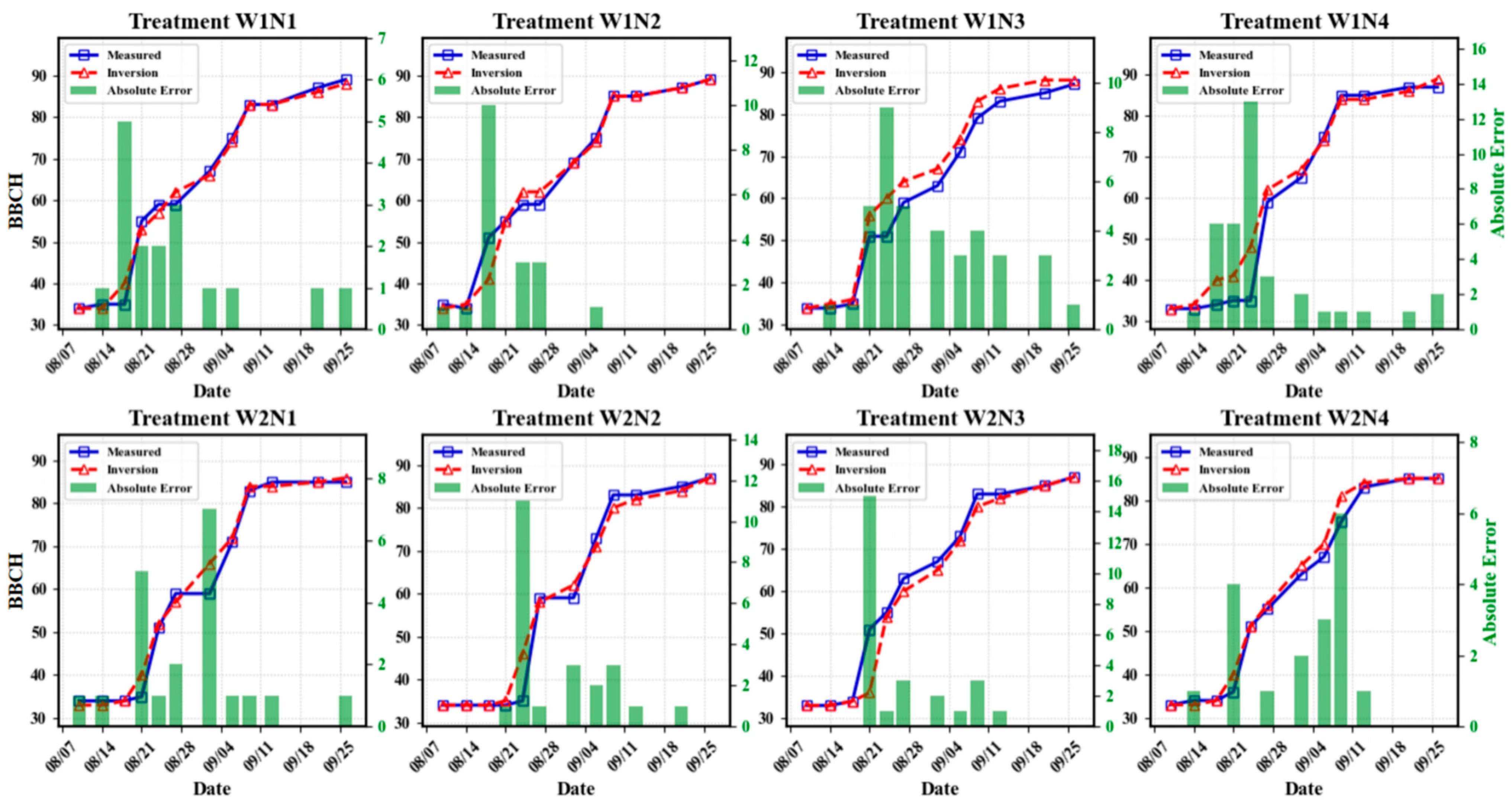 4.1. Effects of Water and Nitrogen on Crop Phenology and Model Retrieval Performance