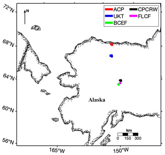 The SnowEx 2022–2023 campaign (SnowEx23) focuses on tundra and boreal forest regions of Alaska to collect observations of snow in these unique environments [34]. Data were acquired at five field sites between spring 2022 and spring 2023 [35]. The Bonanza Creek Experimental Forest (BCEF), Caribou Poker Creek watershed (CPCRW), and Farmers Loop/Creamer’s Field (FLCF) represent boreal forest environments near Fairbanks, while the Arctic coastal plain (ACP) and Upper Kuparuk Toolik (UKT) sites represent coastal tundra environments on the North Slope. Figure 1 shows the five SnowEx sites in Alaska. Snow free surveys were generally scheduled during summer periods with minimal foliage to maximize bare earth coverage. The accuracy of SnowEx23 DTMs is estimated at ~5 cm, with precision of ~1 mm, referenced directly to WGS84 [34]. Here, accuracy refers to the absolute agreement with an external reference, whereas precision describes the repeatability or internal consistency of the measurements [34]. Products are provided at 0.5 m spatial resolution, and no additional datum correction was required.