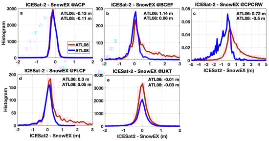 Histogram of surface elevation differences between ICESat-2 and SnowEx in Alaska during snow-off seasons at (a) ACP, (b) BCEF, (c) CPCRW, (d) FLCF, and (e) UKT sites; Red curves correspond to ATL06 results, and blue curves to ATL08 results. The values indicated in the figure correspond to the median differences.