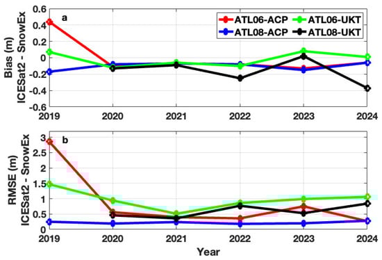 Year-to-year comparison of ICESat-2 surface elevations relative to SnowEx from 2019 to 2024. (a) Bias and (b) RMSE of surface elevation differences. ATL06 results at ACP are shown in red and at UKT in green; ATL08 results at ACP are shown in blue and at UKT in black. ATL08 data for the UKT 2019 are not available.