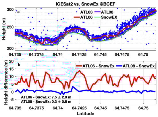 (a) ICESat-2 photon heights (blue dots), surface elevations from ATL06 (red) and ATL08 (purple) on 11 August 2022, compared with SnowEx surface elevations (green) on 28 May 2022, over the BCEF region; (b) Surface elevation differences between ICESat-2 and SnowEx, with ATL06 shown in red and ATL08 in blue.