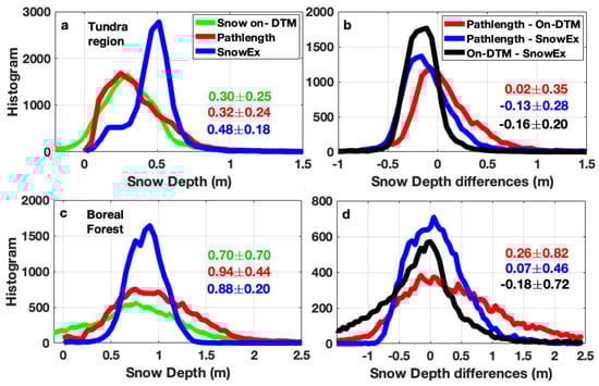 Histogram plots of snow depth (a,c) and snow depth differences (b,d) for March 2022 and 2023 over Alaska tundra (upper panels) and boreal forests (lower panels). Numbers indicate the median and standard deviation for each curve. Snow depth biases relative to SnowEx are largely due to temporal offsets between ICESat-2 and SnowEx snow-on measurements (see Section 6 and Appendix A). The snow-on-DTM (green) and pathlength methods (red) in panels (a,c), which use the same ICESat-2 snow-on measurements, show good agreement.