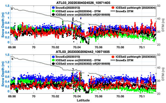 Snow depth comparisons along ICESat-2 strong beam 2 (upper panel) and beam 3 (lower panel) as shown in Figure A1. Blue dots indicate SnowEx measurements, red dots represent snow depth from the pathlength method, and green dots show snow depth from the snow-on–off method.