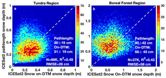Comparison of snow depth retrieved by snow-on-DTM (x-axis) and pathlength (y-axis) methods over Alaska tundra (a) and boreal forests (b) in December–March from 2020 to 2024. Colors indicate the collocated measurements. The 1:1 line is plotted as a white dashed line.