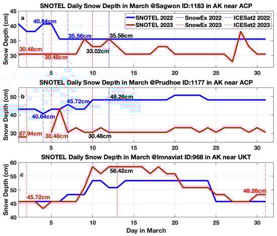 Time series of daily snow depth from SNOTEL stations near ACP (a,b) and UKT (c) sites in March 2022 (blue line) and 2023 (red line). Vertical dashed lines indicate ICESat-2 measurement dates in 2022 (blue) and 2023 (red), while vertical solid lines indicate SnowEx measurement dates in 2022 (blue) and 2023 (red).