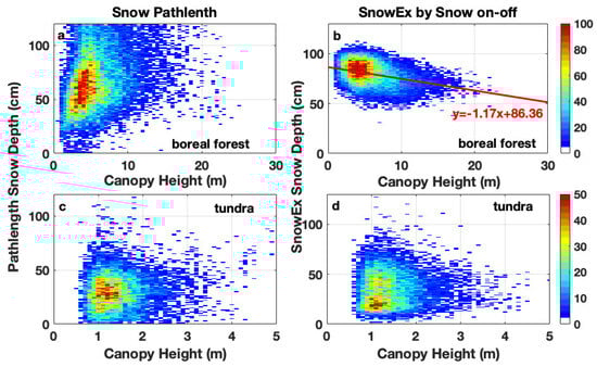 Snow depth as a function of canopy height derived from the pathlength (a,c) and SnowEx snow-on–off (b,d) methods over boreal forest (a,b) and tundra (c,d) sites.