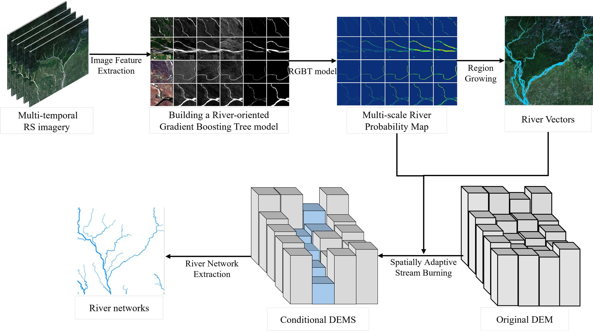 - A novel method integrating river probability learning with adaptive stream burning is proposed for high-precision river network extraction.