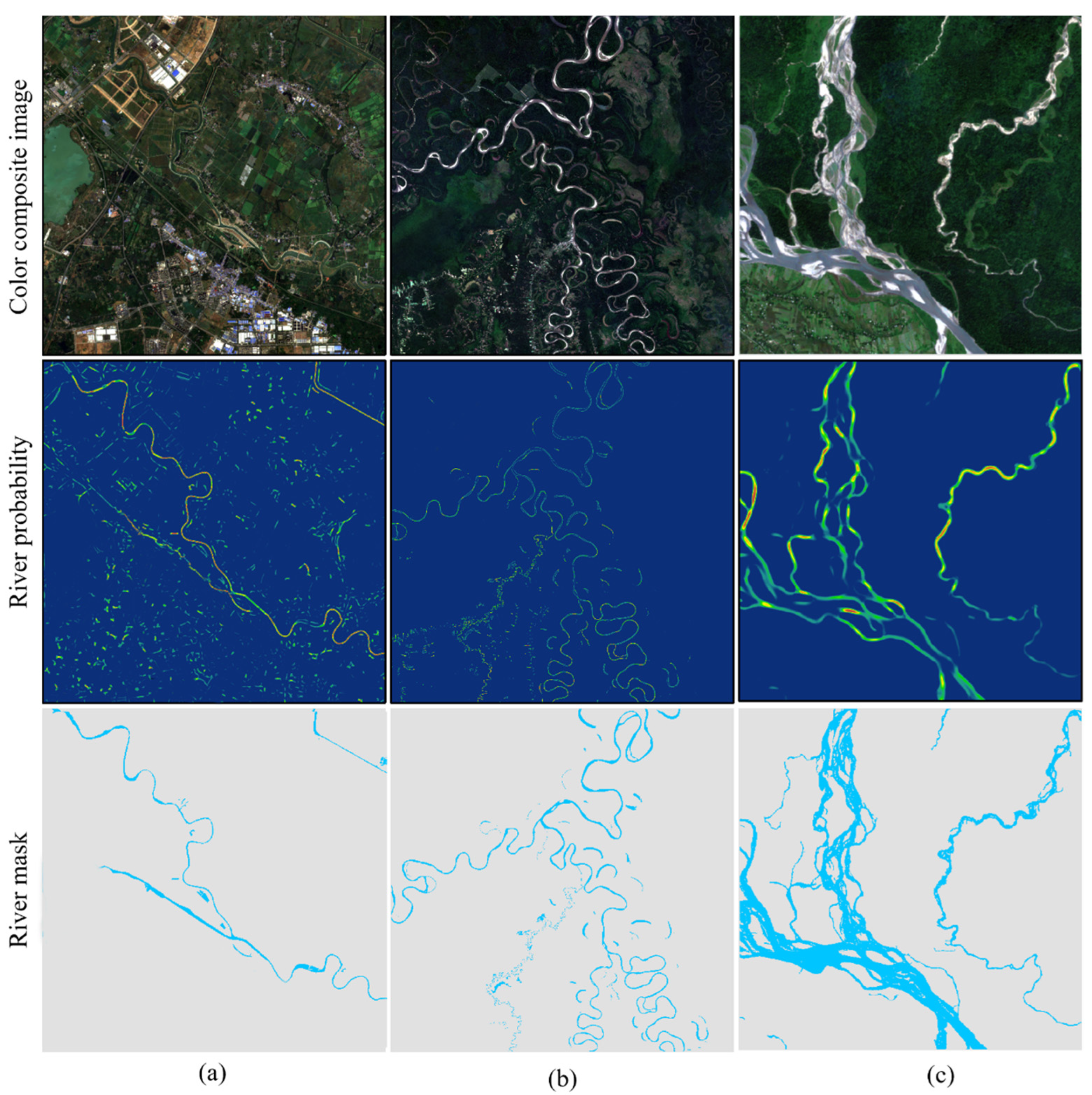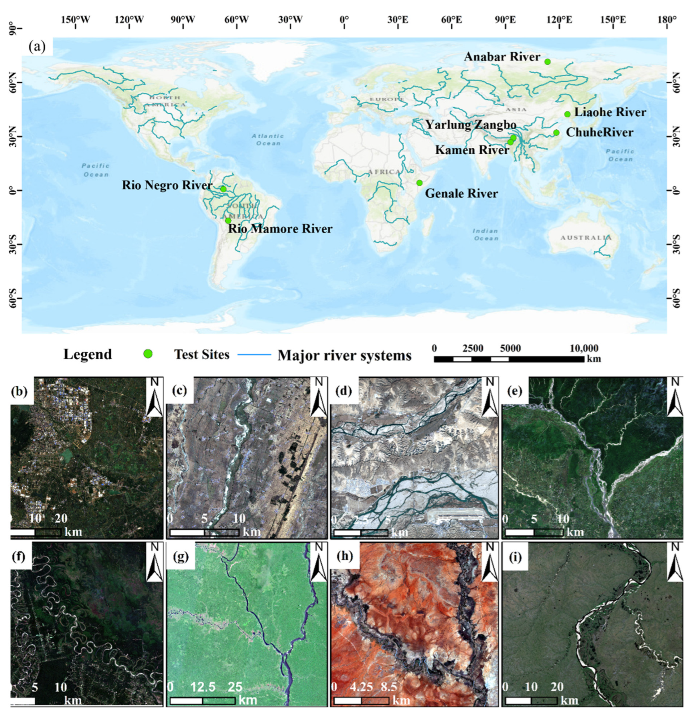 - Xue, Y.; Qin, C.; Wu, B.; Li, D.; Fu, X. Automatic extraction of mountain river surface and width based on multisource high-resolution satellite images. Remote Sens. 2022, 14, 2370. [Google Scholar] [CrossRef]