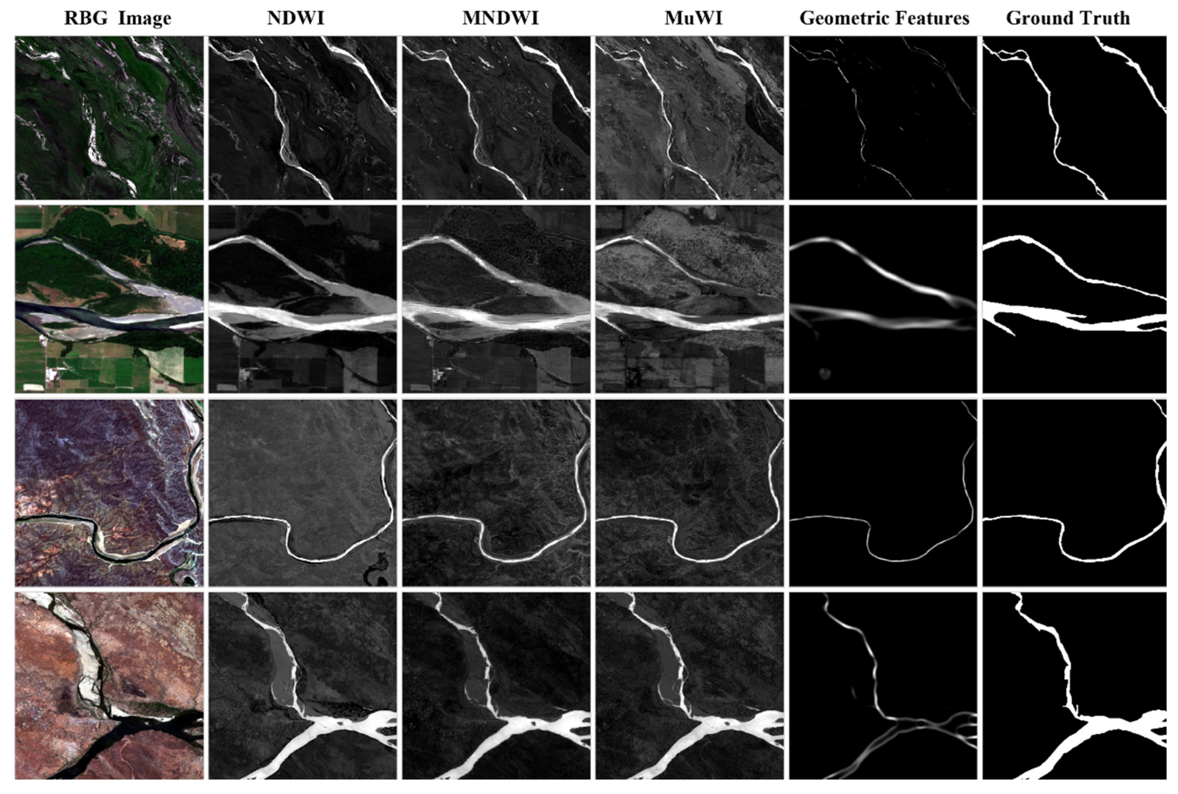 - Unified multi-dimensional feature vectors are constructed, integrating water-oriented spectral indices and multi-scale linear geometric features to provide a comprehensive representation for distinguishing complex morphological rivers from complex backgrounds.