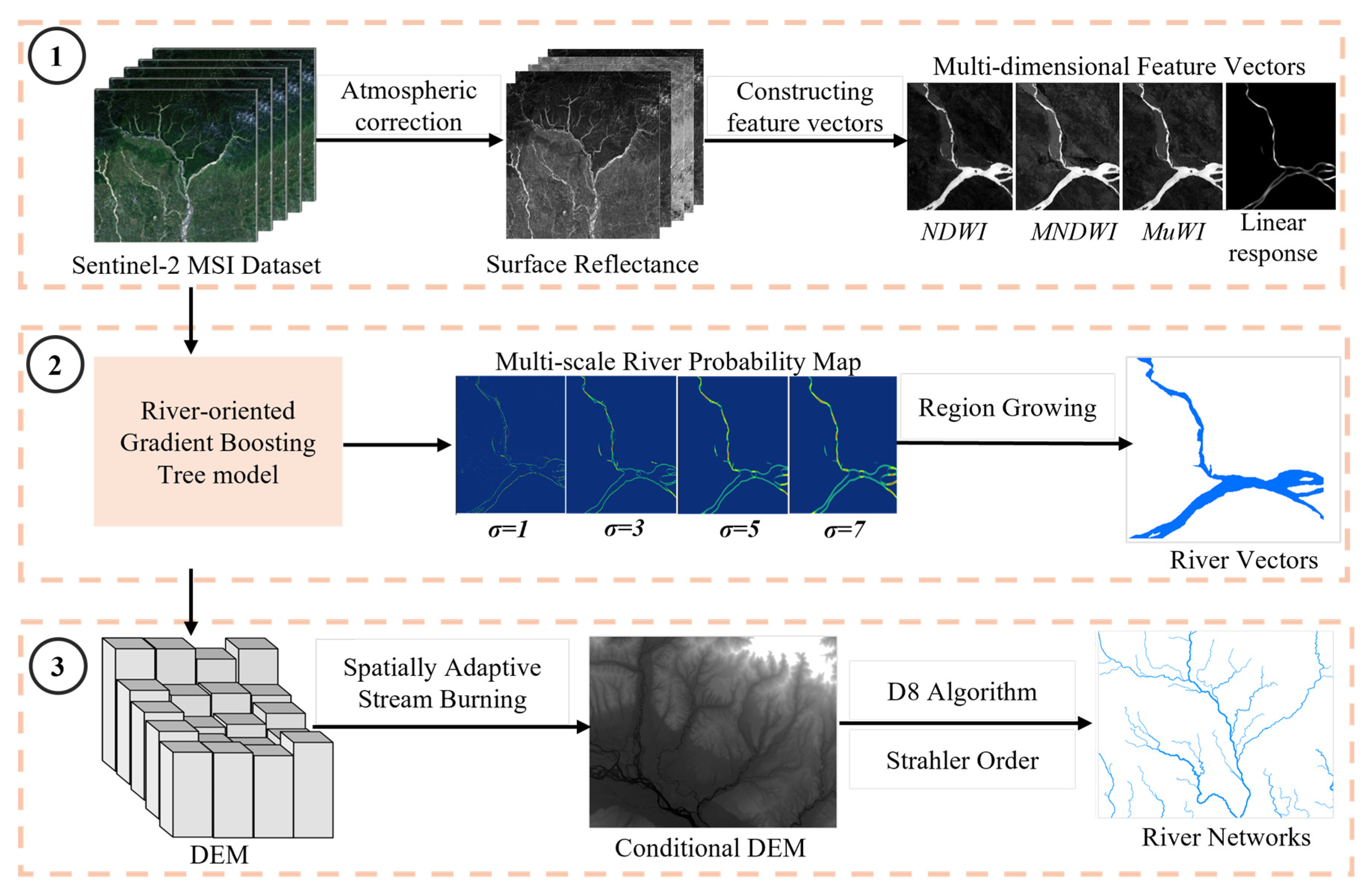 - A probabilistic and morphology-aware extraction framework is developed, combining a River-oriented Gradient Boosting Tree model with direction-constrained region growing to generate geometrically accurate river vectors.