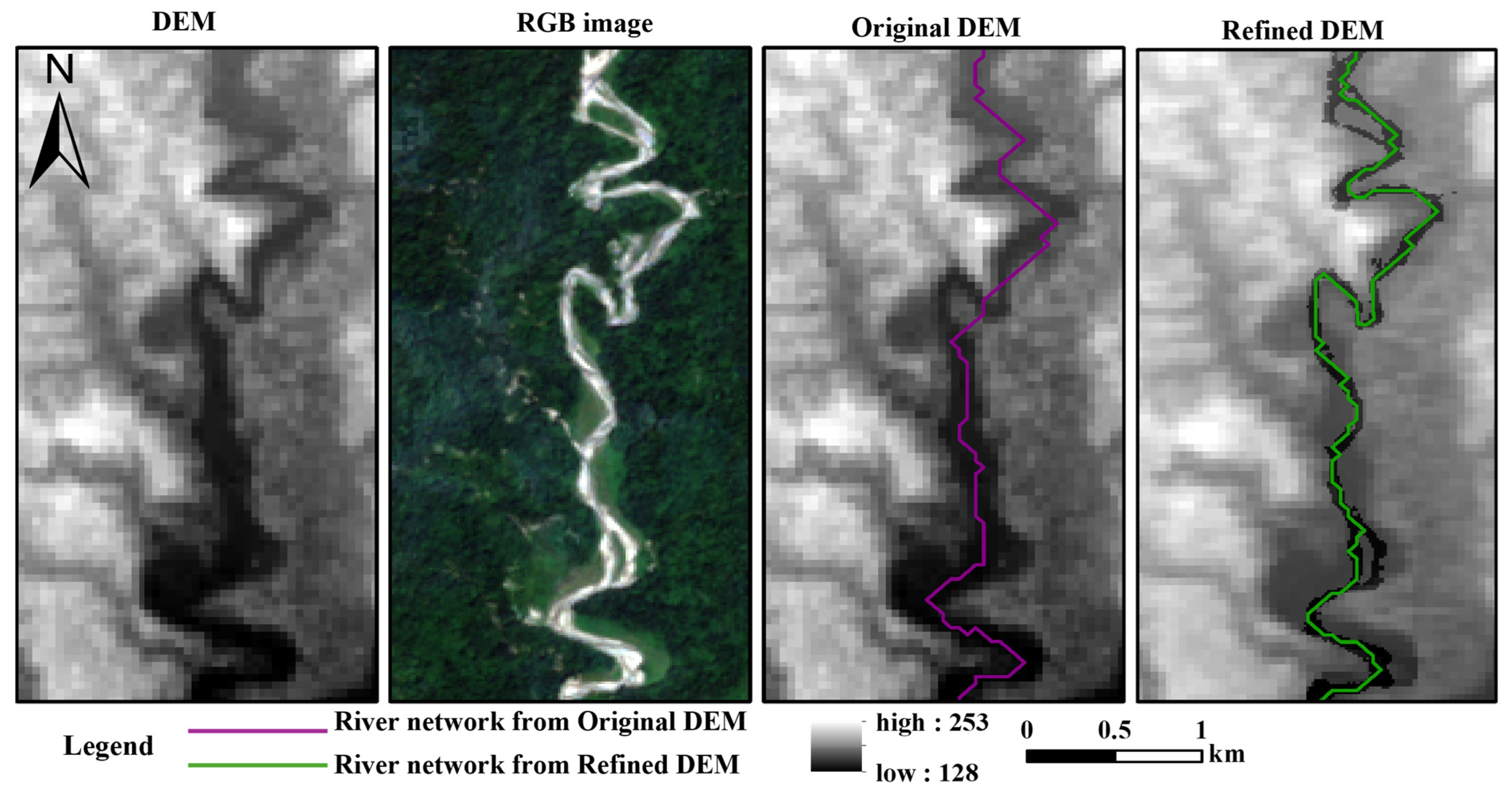 - Lindsay, J.B. The practice of DEM stream burning revisited. Earth Surf. Process. Landf. 2016, 41, 658–668. [Google Scholar] [CrossRef]