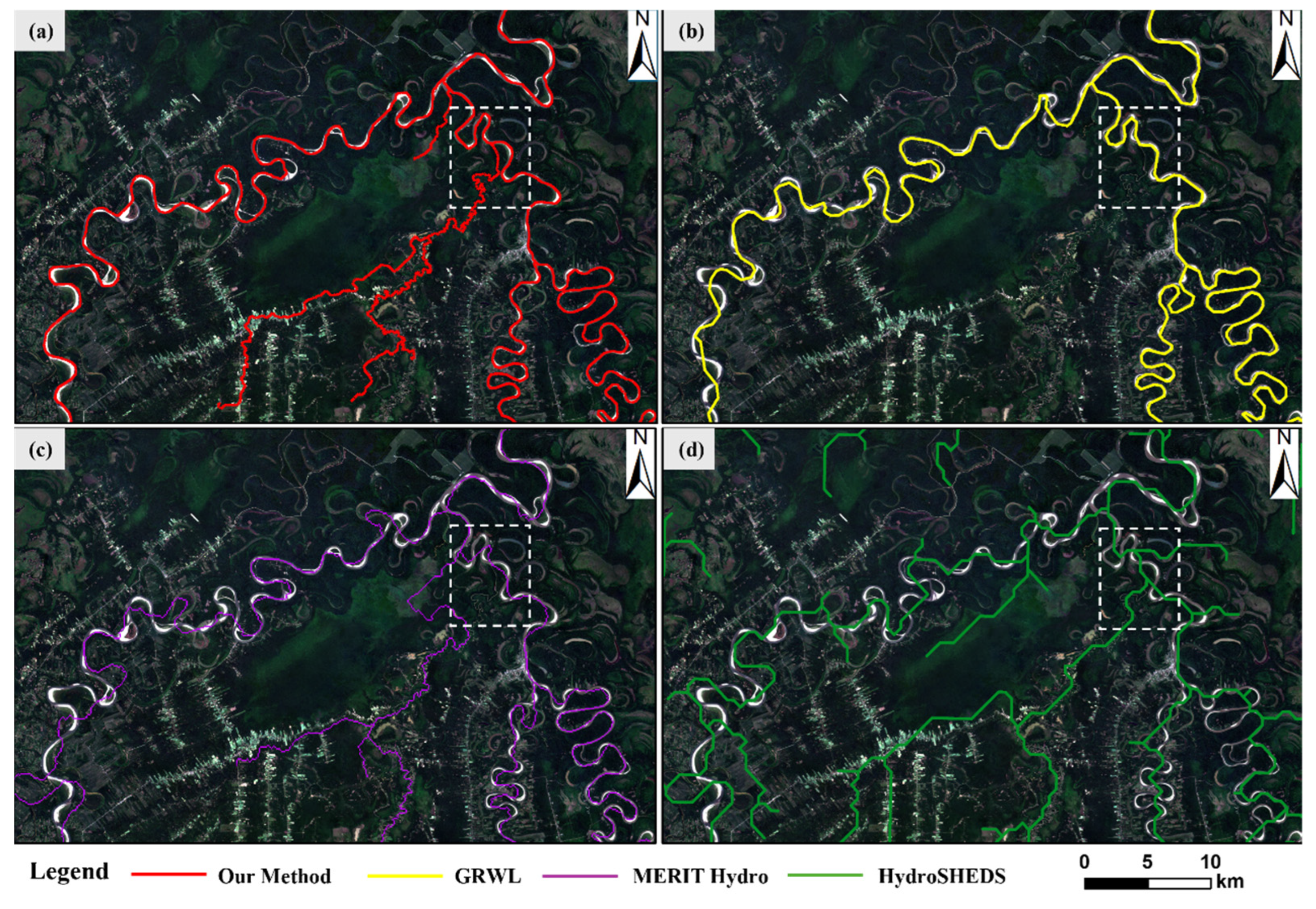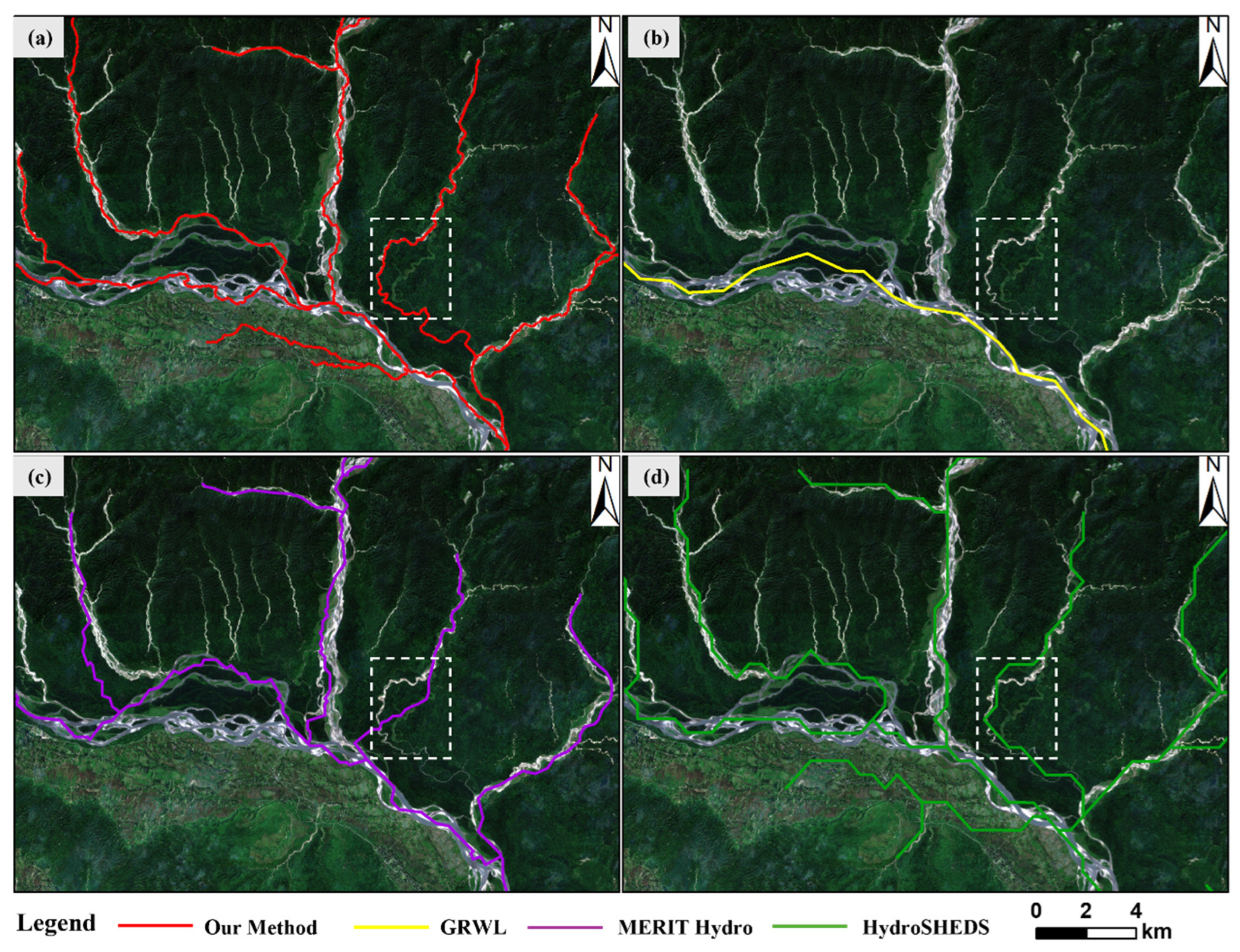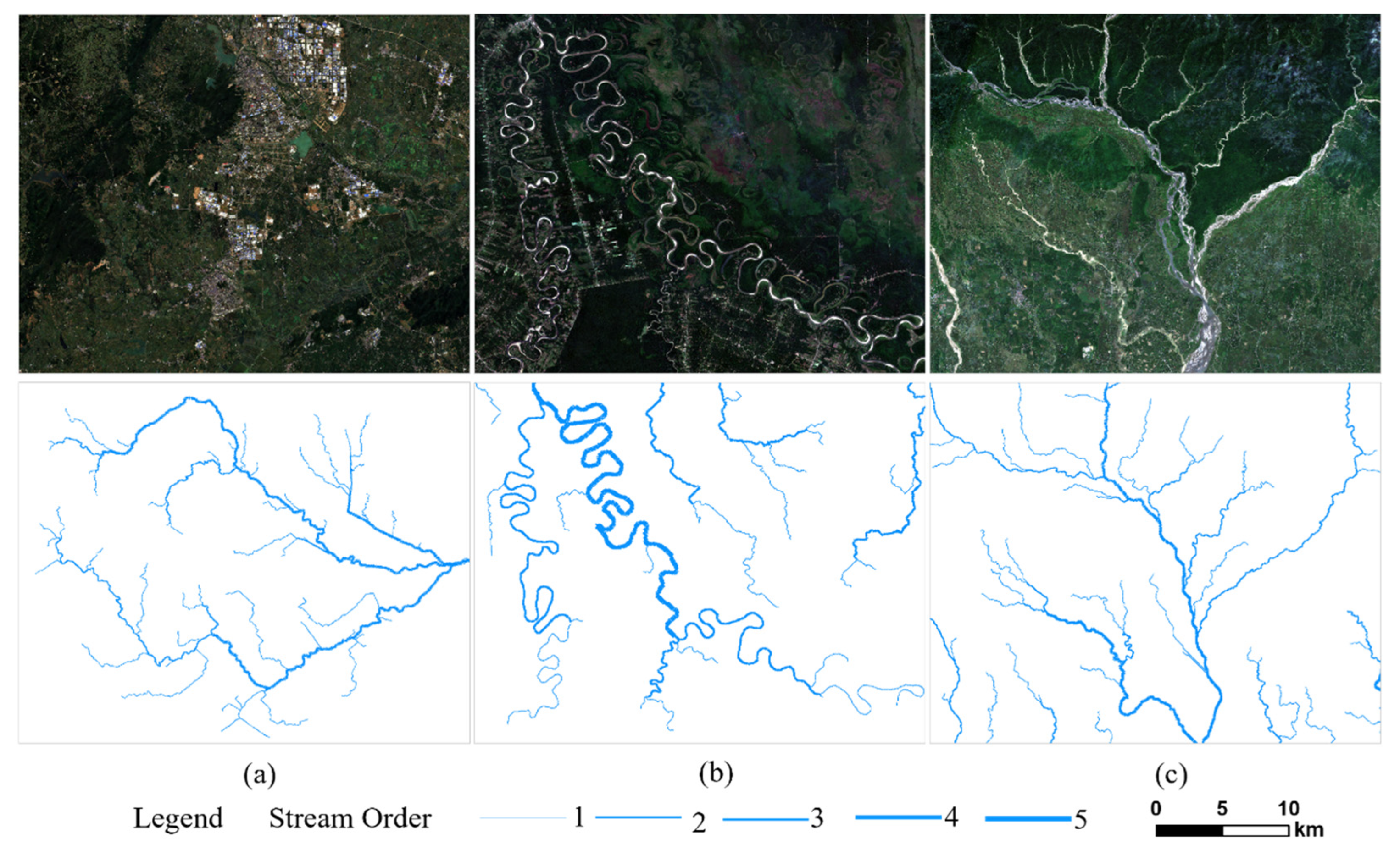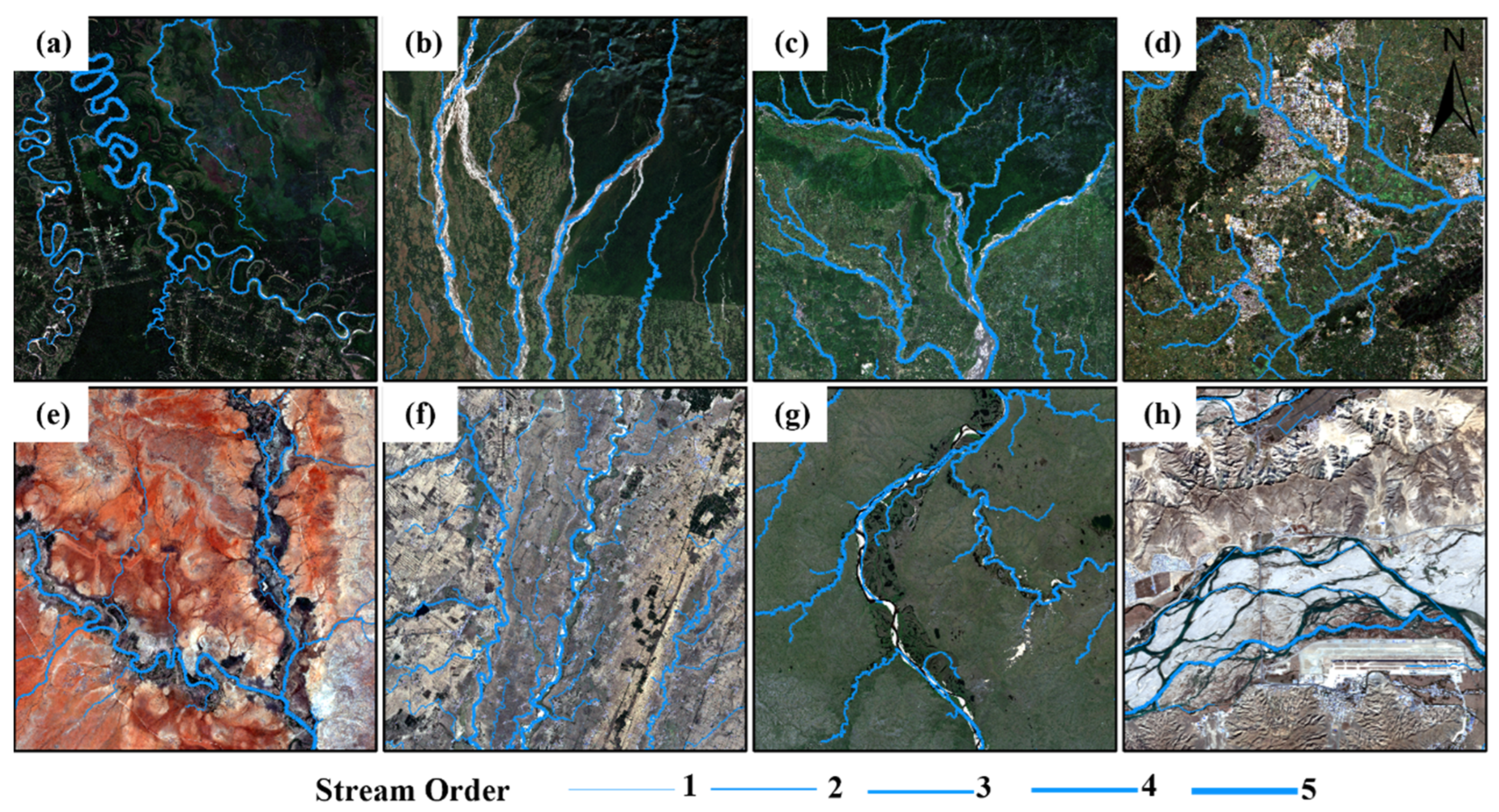 - Li, P.; Yang, S.; Feng, D.; Liu, Y.; Cheng, L.; Liu, X.; Liu, X.; Zheng, C.; Zheng, Y.; Wang, H. High spatiotemporal resolution river networks mapping on catchment scale using satellite remote sensing imagery and DEM data. Geophys. Res. Lett. 2024, 51, e2023GL107956. [Google Scholar] [CrossRef]