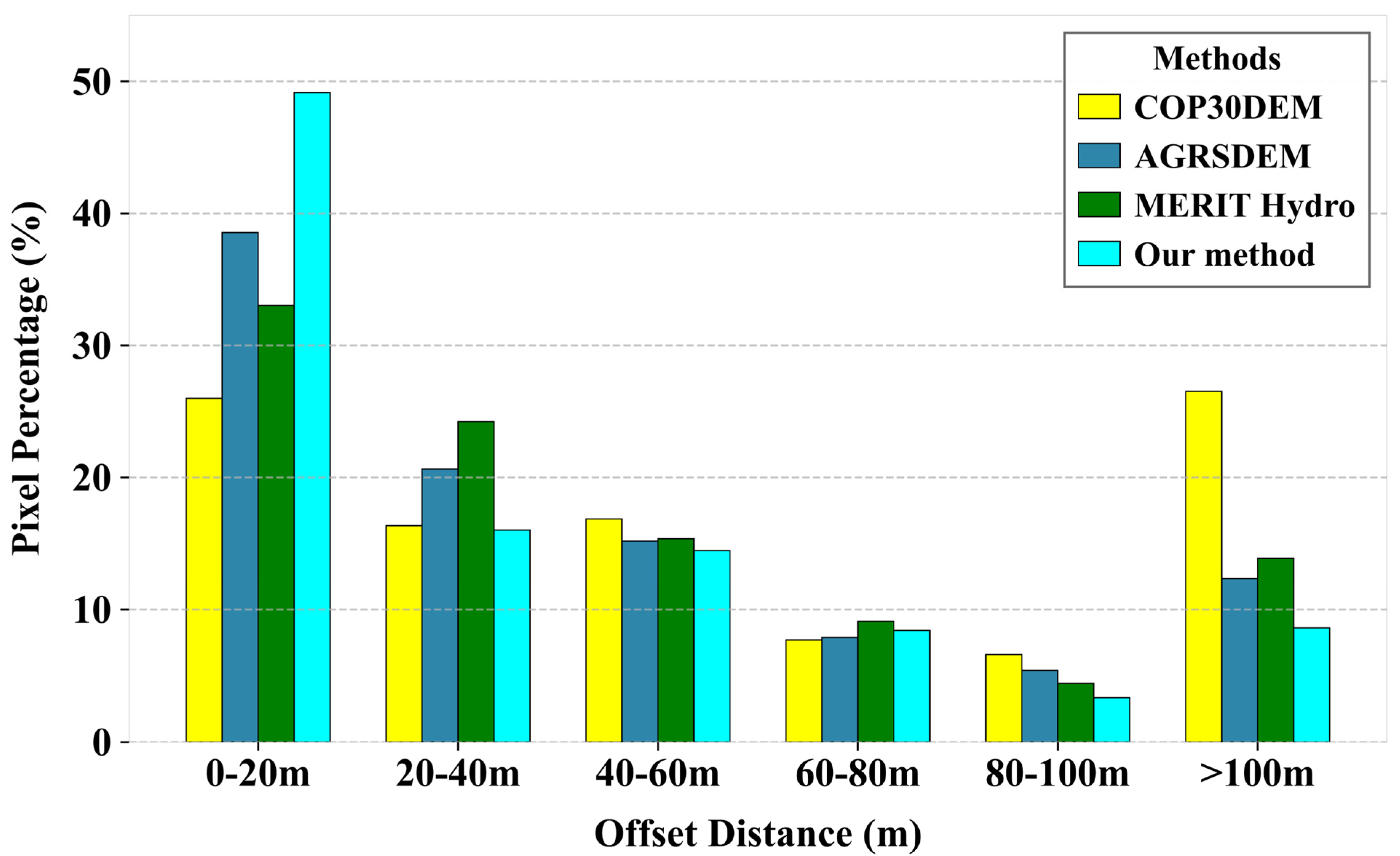 - We propose spatially adaptive stream burning, which dynamically adjusts burning depth using local channel characteristics to produce a hydrologically conditioned DEM, significantly enhancing the positional accuracy and network continuity.
