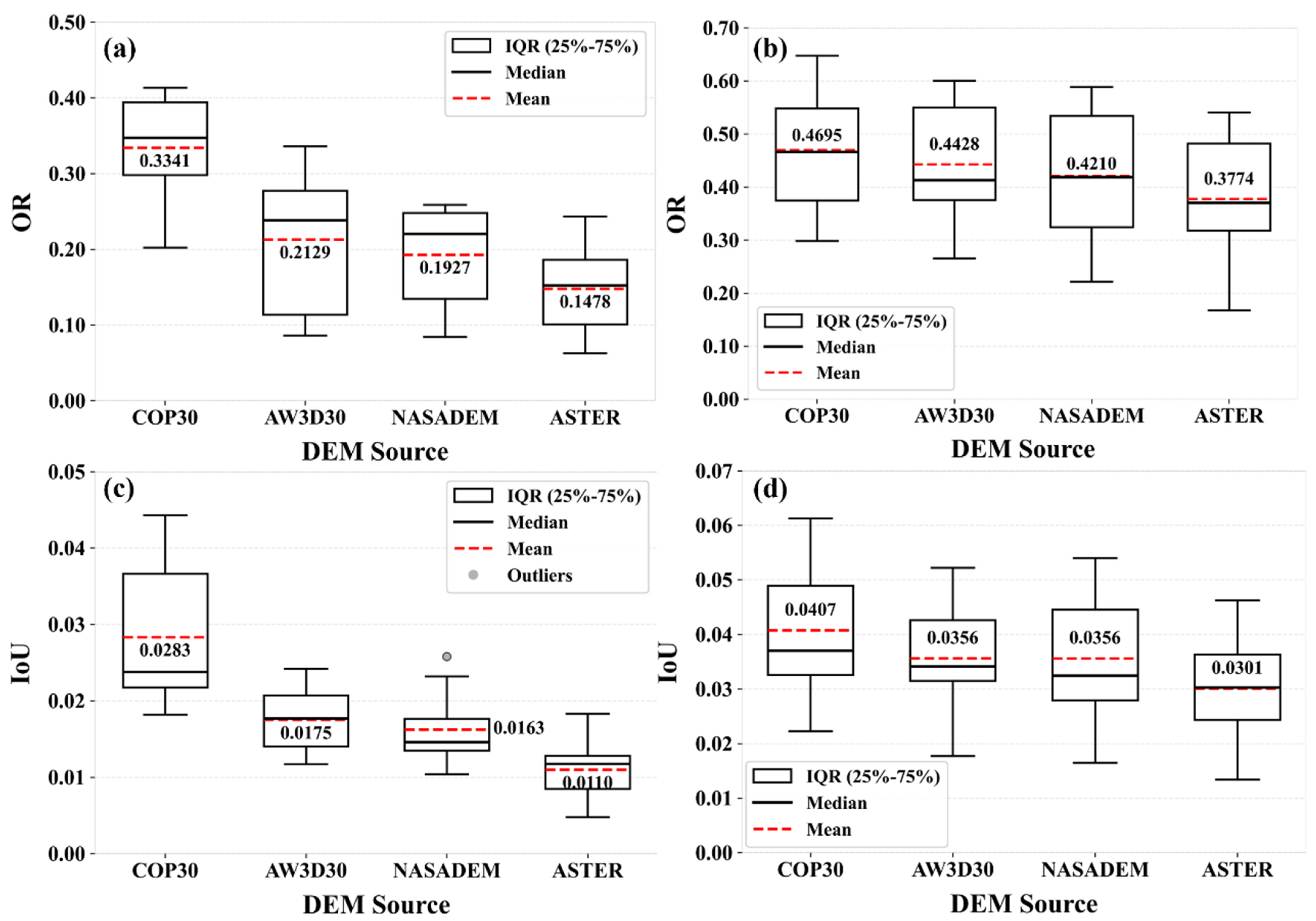 | AW3D30 [43] | 30 m | ~8.6 m | 2006–2011 | JAXA’s ALOS PRISM-based product |