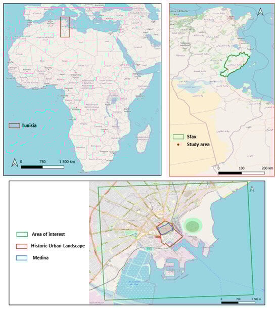 Location of the study area in Africa and Tunisia with the Historic Urban Landscape boundaries.