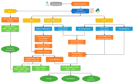Thermal and meteorological satellites deliver temperature and other climatic parameters that are instrumental in studying various climate change-related phenomena [16], such as wildfires [17] and floods [18], and those contributing to it, such as air pollution [19] and urbanisation [20]. The global reanalysis product ERA5 provides multiple open climate data in a gridded format from the European Centre for Medium-Range Weather Forecasts (ECMWF), provides accurate ECVs, and is commonly used by researchers [21,22]. Additionally, urban spectral indices (USI) derived from satellite surface reflectance data, such as Landsat’s and Sentinel’s, play a critical role in extracting valuable information for quantification of urban land cover changes [23], which is a crucial aspect of ECVs. They also provide insights into the interactions between urbanisation and climate change [24]. However, the extraction of urban land cover information from USI remains challenging, considering that urban areas have complex spectral properties. Therefore, a wide range of comparative studies for assessing the performance of different USIs and the threshold methods are present in the literature [25,26,27].