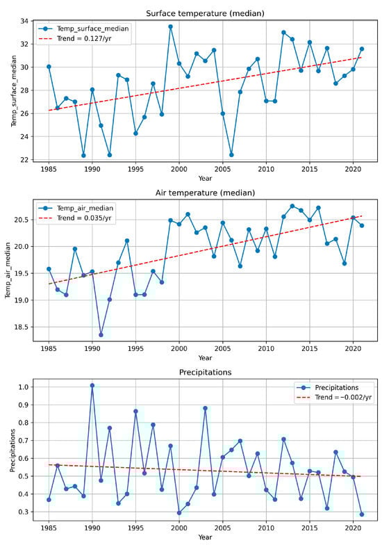 For the other ECVs related to temperature, wind, and precipitation, we calculated the annual median from 1985 to 2021 and generated a data frame. In this study, we chose the median to yearly group the ECVs rather than the mean to avoid the influence of extreme values, which are common in environmental datasets [70], and ensure robust temporal trends. To calculate interrelations between ECVs, we concatenated the data frames of annual median values. We predicted trends with linear regression and assessed the distribution with the Shapiro–Wilk test using the scipy_stats library from Python. We then performed Spearman’s and Kendall’s correlation coefficient calculations using the pandas’ correlation function. We also performed multivariate linear regression with the sklearn.linear_model library, choosing Ta and LST as dependent variables and SUIs and PP as independent variables to better understand the interactions between urbanisation and the two-level temperature trends.