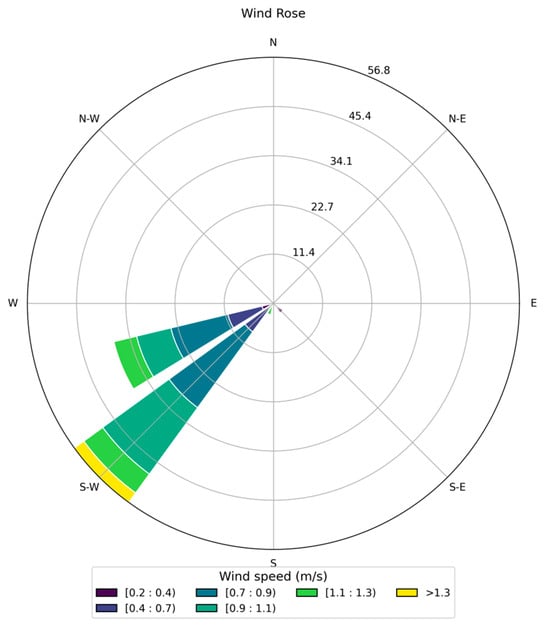 Temperature variables and PP show heterogeneous variations, with increasing trends observed for Ta and LST by 0.035 degrees per year and 0.127 degrees per year, respectively, and a slightly decreasing trend for PP by 0.002 mm per year (Figure 5). The dominant wind direction is southwest, representing more than 50% of occurrences with moderate to high-speed winds with a dominance of winds at the speed of 0.7–1.1 m/s (Figure 6).