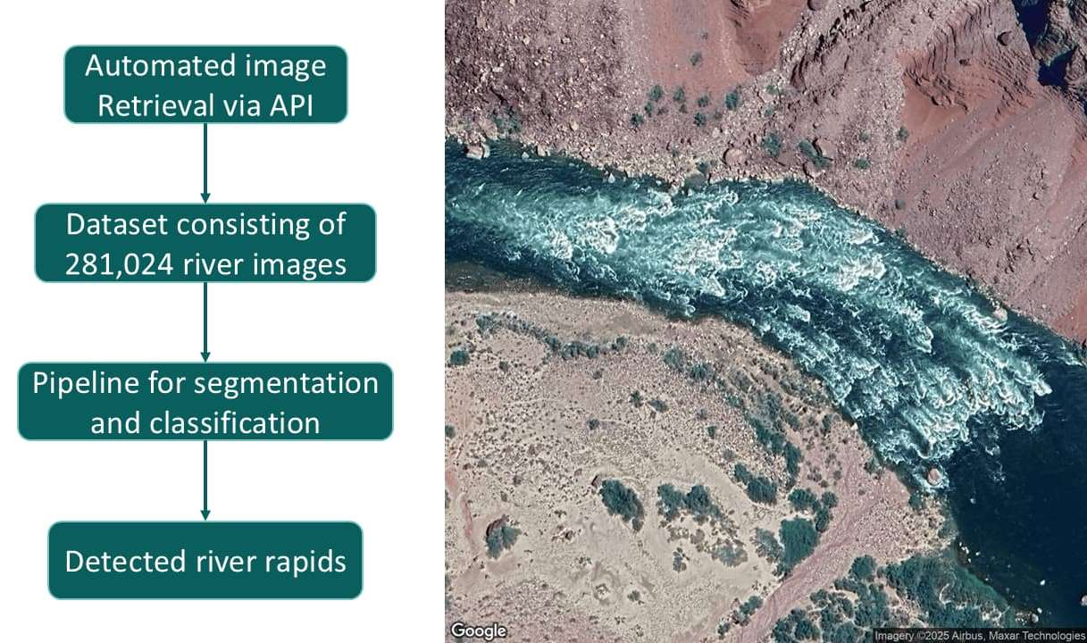 - Establishes a hydrologic dataset that enables new machine learning approaches for characterizing rivers via remote sensing, including advanced river segmentation and detection of rapids.