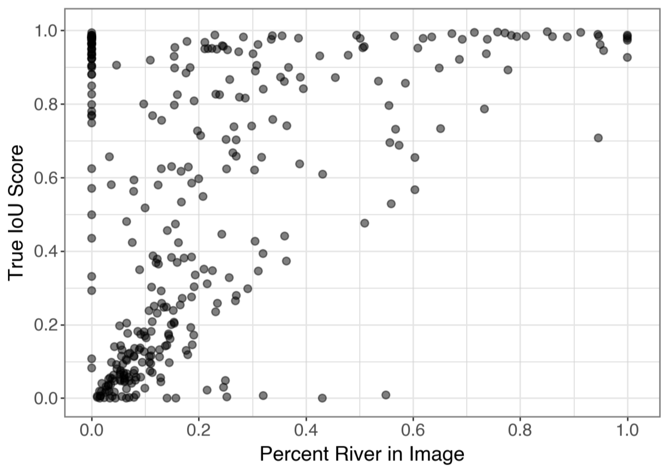 - The segmentation model we developed for identifying river pixels within images led to a mean test of 0.57, which increased to 0.89 when only those images with high confidence were considered. These results suggest that highly automated extraction of rivers from standard, readily available satellite and aerial images is not only feasible but also potentially promising.