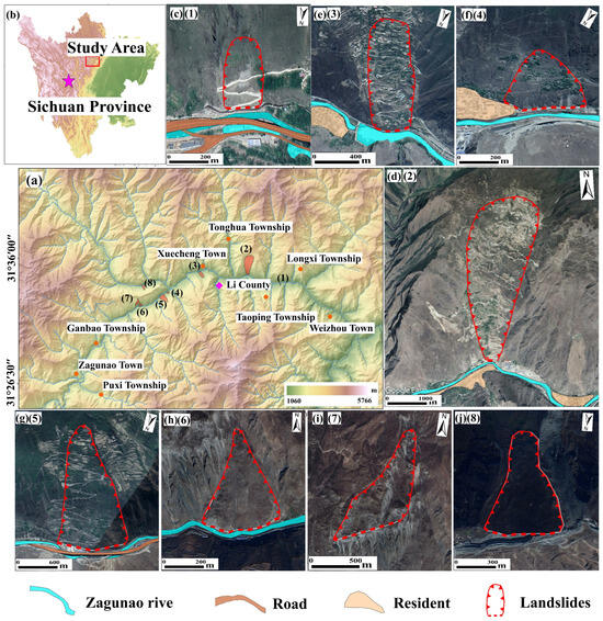 Eight representative creep-type landslides showing pronounced deformation signals were selected within the study area as typical research objects, with detailed geographic information listed in Table 1. These landslides are primarily distributed along the middle-lower mountain slopes on both sides of the Zagunao River and exhibit a generally elongated, belt-like spatial pattern. High-resolution remote sensing imagery and DEMs show that the landslides possess clear boundaries and well-preserved morphological features (Figure 1b–j). Most of them are situated adjacent to the Zagunao River and the riverbank highway, while residential areas, farmland, and various engineering structures are distributed both upslope and downslope. Intensive human activity leads to strong surface disturbance. Once overall sliding or localized acceleration occurs, the landslides could easily block transportation routes, damage residential buildings and infrastructure, and even induce river blockage or secondary landslide-dam flooding. These processes pose severe risks to residents’ lives and property and threaten the safety of regional transportation corridors.