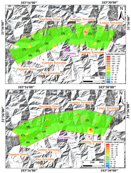 LOS deformation rates from ascending and descending tracks. (a) Descending-track LOS deformation rate map; (b) Ascending-track LOS deformation rate map. (numbers (1)–(8) indicate the locations of the eight representative landslides).