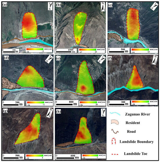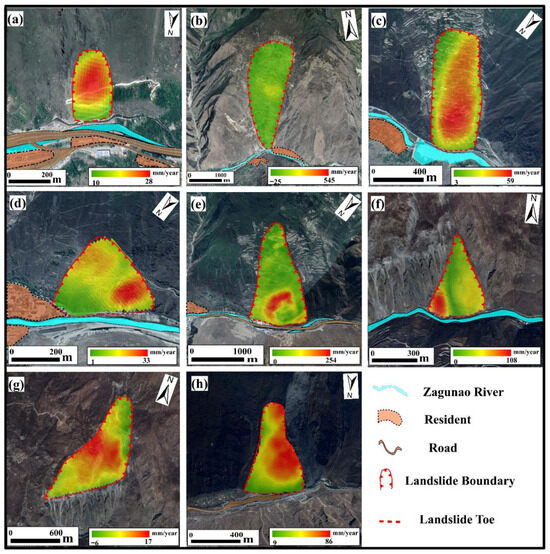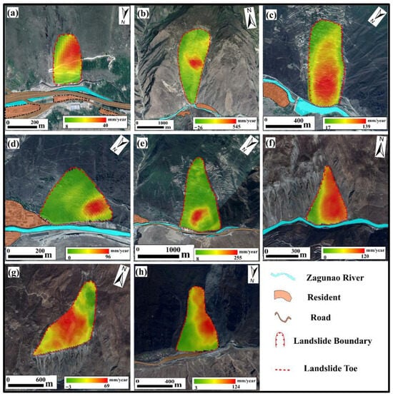 For the Taopingcun landslide, the slope-parallel deformation ranges from 8 to 40 mm/year, directed downslope and mainly concentrated on the upper-right portion of the slope (Figure 6a). The Xishancun landslide shows deformation rates between −26 and 545 mm/year, with deformation concentrated in the mid-slope area (Figure 6b). The Sanzhaicun landslide exhibits deformation ranging from 17 to 139 mm/year, primarily at the slope toe (Figure 6c). The Mashancun No. 01 landslide shows deformation between 0 and 96 mm/year, concentrated on the right side of the slope toe (Figure 6d). For the Mashancun No. 02 landslide, deformation ranges from 8 to 255 mm/year, with the most active zone located in the lower slope (Figure 6e). The Xiaoqicun No. 01 landslide exhibits deformation between 0 and 120 mm/year, mainly on the right side of the slope (Figure 6f). The Xiaoqicun No. 02 landslide shows rates ranging from −3 to 69 mm/year, concentrated in the mid-slope zone (Figure 6g). Finally, the Mengdonggou landslide displays deformation between 3 and 124 mm/year, with activity mainly concentrated on the right side of the slope (Figure 6h).