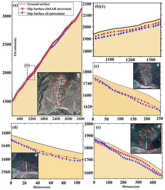 Slip-surface profile validation. (a) Xishancun landslide slip-surface profile validation; (b) Local slip-surface profile validation for the Xishancun landslide; (c) Sanzhaicun landslide slip-surface profile validation; (d) Mashancun No. 01 landslide slip-surface profile validation; (e) Mashancun No. 02 landslide slip-surface profile validation.