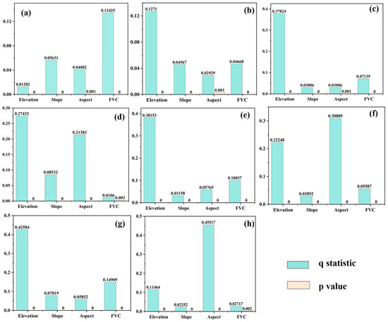 In the equation, h denotes the number of categories of a variable or factor, where h = 1, …, L. Nh and N represent the sample size within category h and the total sample size, respectively. 2h and 2 are the variances of the dependent variable within category hhh and across the entire study area. The term represents the within-group sum of squares (SSW), while represents the total sum of squares (SST). The q-statistic ranges from 0 to 1; a larger q value indicates stronger explanatory power of the factor on the spatial heterogeneity of the dependent variable, whereas a smaller q value indicates weaker explanatory power. When q = 0, the factor has no explanatory effect; when q = 1, the factor fully explains the spatial distribution of the dependent variable [33,34].