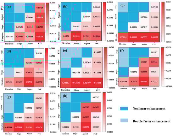 The interaction detector is used to evaluate whether two factors jointly enhance or weaken their explanatory power on the dependent variable, or whether the effect of one factor is independent of the other [31]. The q-values of factors X1 and X2, denoted as q1 and q2, are obtained using the factor detector. The interaction detector then computes the interaction q-value of X1 and X2, and compares it with q1 and q2 to determine the type of interaction. Here, Min (q1, q2) denotes the smaller of the two q-values, Max (q1, q2) denotes the larger, and q1 + q2 denotes their sum (Table 3).