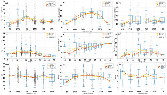 Analysis of the boxplots of slope versus elevation reveals notable differences in slope distribution across the four landslides. For the Xishancun landslide (Figure 15a), slope angles generally decrease with increasing elevation: steep slopes dominate the lower elevations (around 1500 m), while higher elevations (around 2900 m) are relatively gentle. The Mashancun No. 1 landslide (Figure 15b) shows a pronounced steep segment at approximately 1605 m, after which the slope gradually decreases with increasing elevation. In the Mashancun No. 2 landslide (Figure 15c), slope angles rise rapidly from 1575 m to about 1675 m, remain high within the mid-elevation range of 1675–1825 m, and then slightly decrease at higher elevations. The Xiaoqicun No. 1 landslide (Figure 15d) exhibits increasing slope angles from 1550 m to 1850 m, reaching a maximum near 1850 m before gradually flattening.
