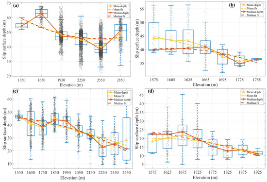 Statistical relationship between slip-surface depth and elevation. (a) Slip-surface depth vs. elevation for the Xishancun landslide; (b) Slip-surface depth vs. elevation for the Mashancun No. 1 landslide; (c) Slip-surface depth vs. elevation for the Mashancun No. 2 landslide; (d) Slip-surface depth vs. elevation for the Xiaoqicun No. 1 landslide.