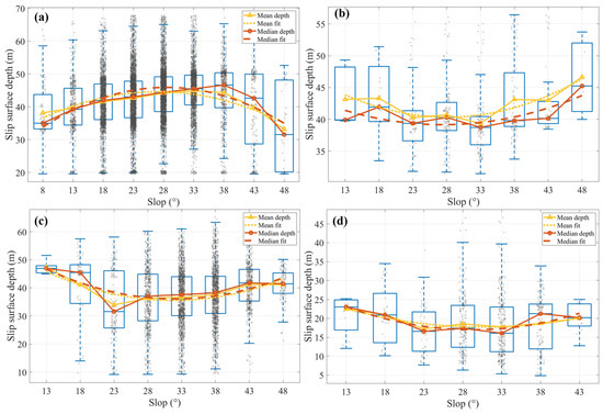 Statistical relationship between slip-surface depth and slope. (a) Slip-surface depth vs. slope for the Xishancun landslide; (b) Slip-surface depth vs. slope for the Mashancun No. 1 landslide; (c) Slip-surface depth vs. slope for the Mashancun No. 2 landslide; (d) Slip-surface depth vs. slope for the Xiaoqicun No. 1 landslide.