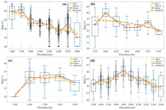 Statistical relationship between elevation and slope for the landslides. (a) Elevation vs. slope for the Xishancun landslide; (b) Elevation vs. slope for the Mashancun No. 1 landslide; (c) Elevation vs. slope for the Mashancun No. 2 landslide; (d) Elevation vs. slope for the Xiaoqicun No. 1 landslide.