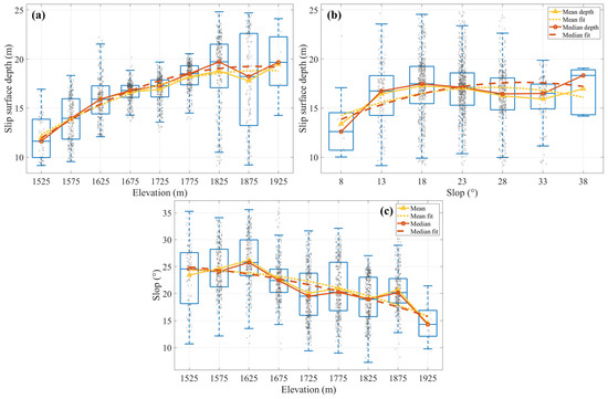 Statistical relationships among slip-surface depth, elevation, and slope for the Sanzhaicun landslide. (a) Slip-surface depth vs. elevation; (b) Slip-surface depth vs. slope; (c) Elevation vs. slope.