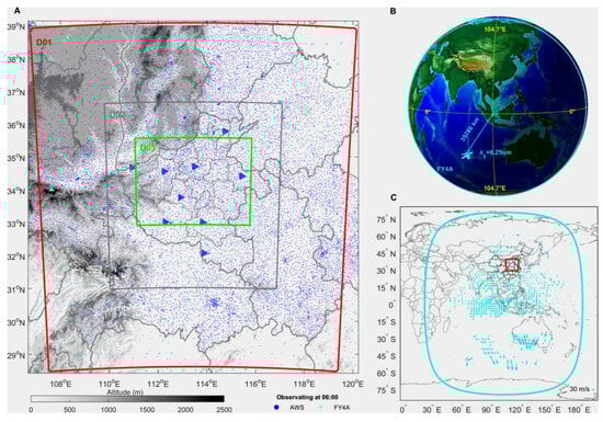 (A). Domains and observations: mesoscale (12 km; red box, D01), small-scale (4 km; gray box, D02), and microscale (1 km; green, D03); FY4A quality-controlled 3D wind vectors at 06:00 UTC (cyan plus), automatic weather stations (AWS, blue dots), and S-band Doppler radar (blue sector, azimuth −45°); terrain (shaded; m). (B). FY4A on-orbit schematic and key parameters: field of view (cyan circle), sub-satellite point (yellow dashed cross), satellite-earth distance, and core wavelengths of 3D wind observations. (C). On equidistant cylindrical projection: FY4A coverage at 06:00 UTC (cyan ellipse), ch09 AMV winds (vectors; m/s), and D01 location (red box).