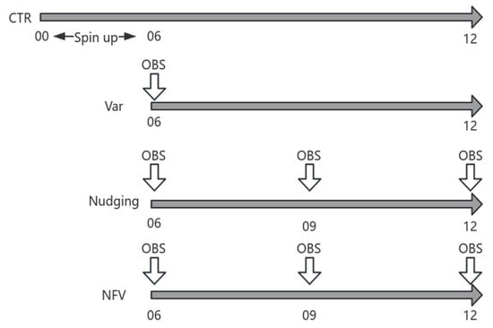As shown in Figure 2, the NFV scheme is based on WRF 3DVar (green solid line) for high-resolution assimilation [62], and is driven by large-scale Nudging through OA (blue solid line) and FDDA (red solid line), completed in four steps.