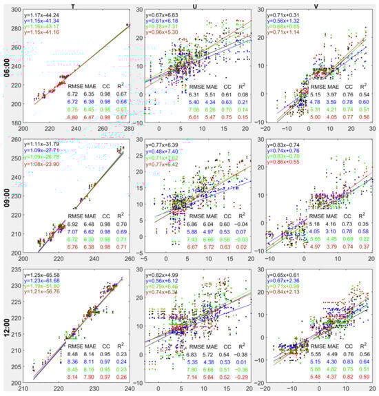Fitting between forecasts and FY4A 3D winds are shown in Figure 7. For T, linear coefficients slightly exceed 1 and intercepts are large, indicating systematic forecast deviation that is most pronounced at 12 UTC. For U and V, coefficients are below 1, indicating adjustment toward observations.