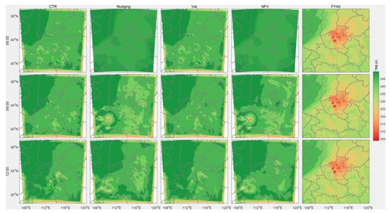 Due to the limited retrieval resolution of the RTTOV14 model, forecasts from the coarser D01 domain are used for RTTOV14 simulations and compared with FY4A ch09 TBB (Figure 8). Although significant magnitude differences exist, the northeast–high–southwest–low TBB pattern in all experiments agrees well with observations. Notably, compared with CTR and Var, Nudging and NFV better reproduce the observed patchy low-value regions at 09 and 12 UTC.
