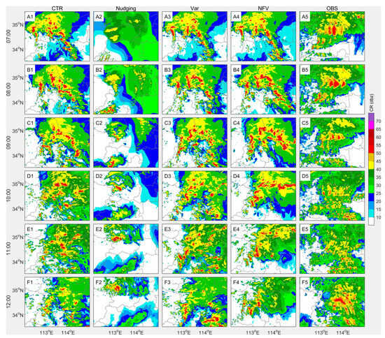 During 07~10 UTC, CTR, 3DVar, and NFV produces similar SHR patterns, all larger than observed; the extreme point “x” is shifted north by CTR, while Var and NFV are closest to observations (Figure 11A1–D1,A3–D3,A4–D4). At 09 UTC, Var’s extreme reaches 125 mm (Figure 11C3); afterward, their positions diverge and areas shrink below those observed. Nudging’s SHR area is markedly smaller, confined to western Zhengzhou (Figure 11A2–F2).
